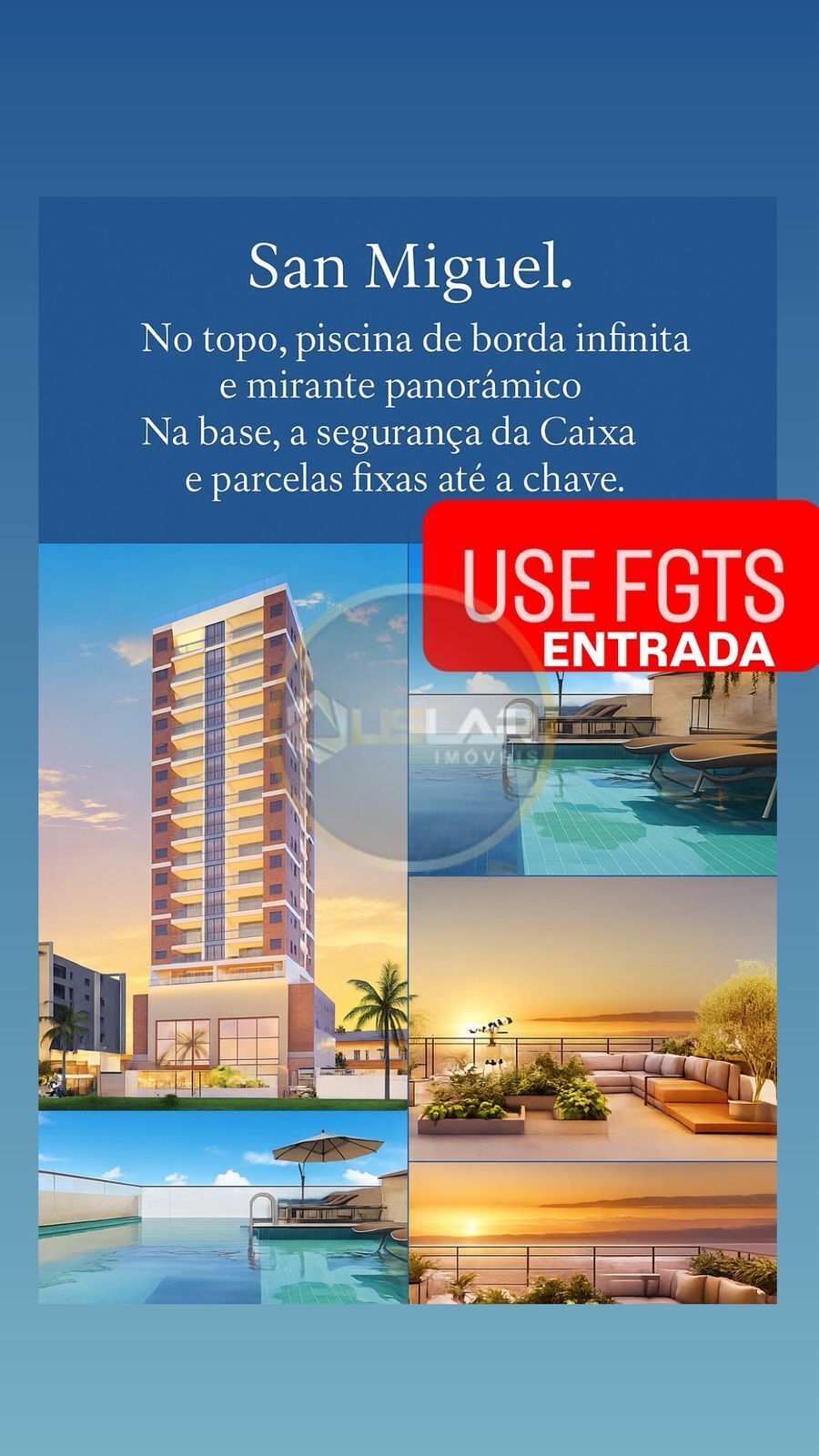Exclusividade: lazer no topo do edifício, (26° e 27° pavimentos) com piscina de borda infinita, spa, jacuzzi, massagem e mirante panorâmico.