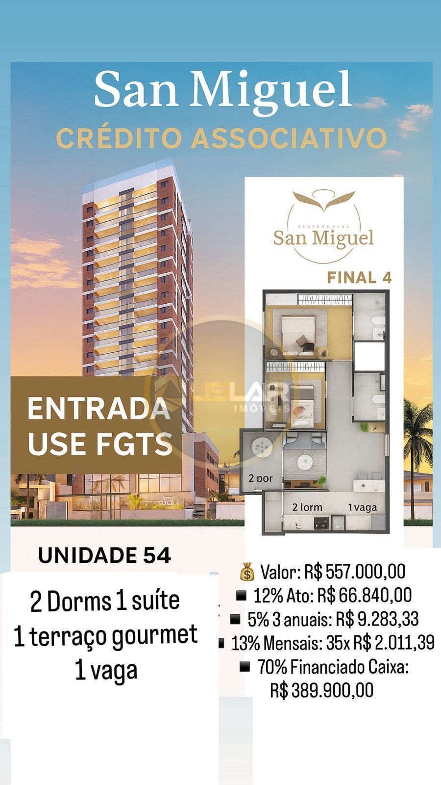 70% financiado Caixa: R$ 389.900,00.